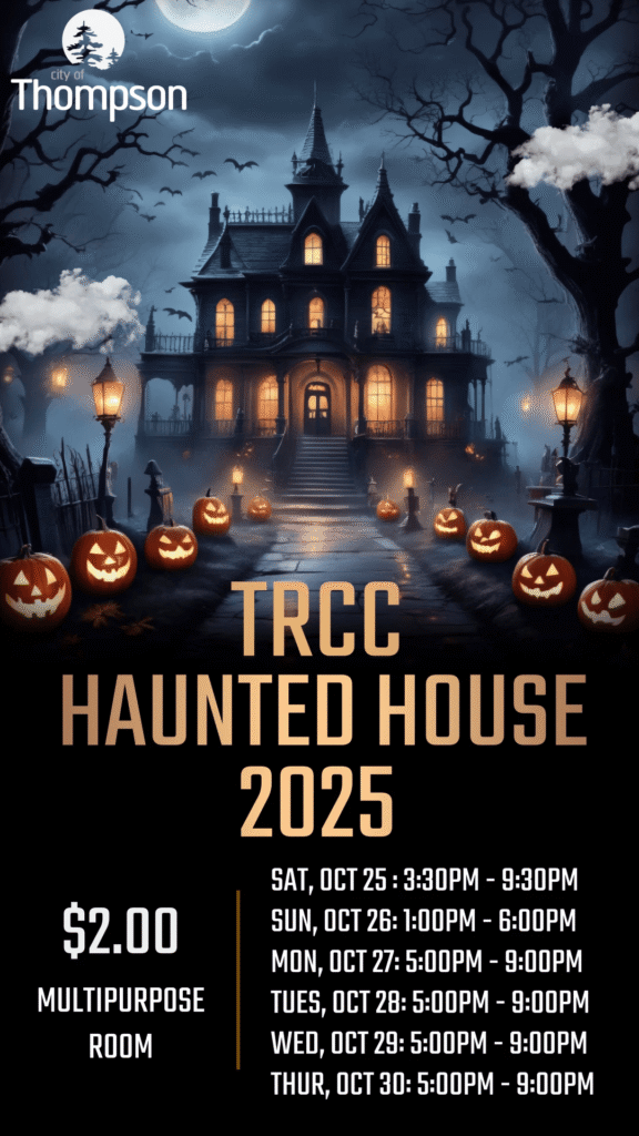TRCC Haunted House Date: October 26, 2025 Add to Calendar Google CalendarMicrosoft OutlookApple CalendarDownload Time: 1:00 PM - 6:00 PM Venue: Thompson Regional Community Centre (TRCC) Location: 274 Thompson Drive, Thompson. More info Calendar: Community Events